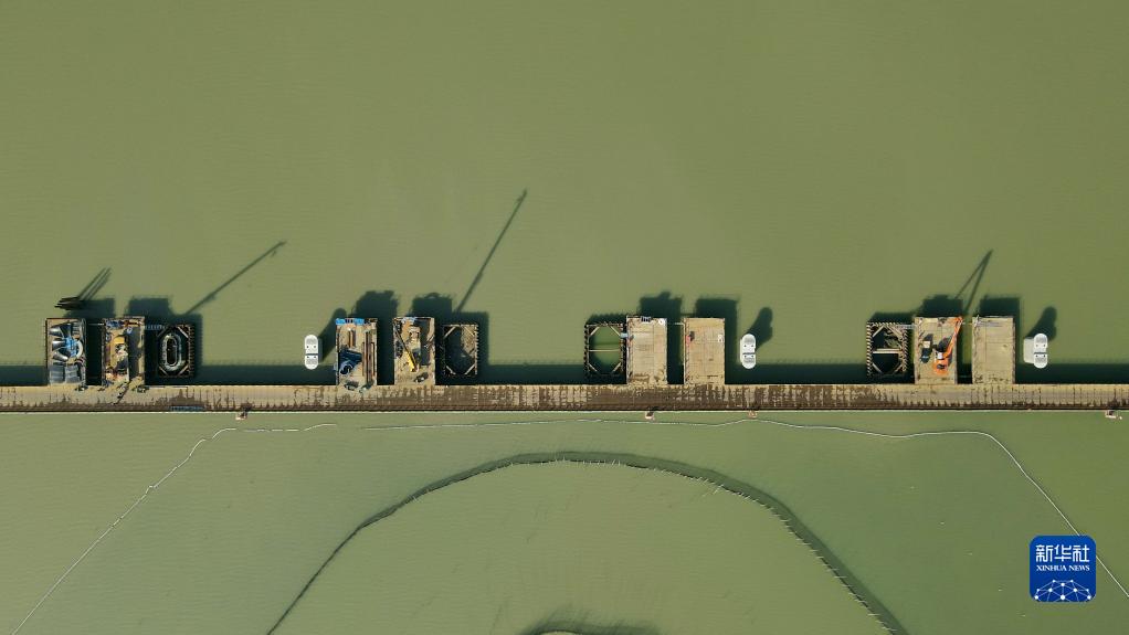 这是2月15日拍摄的合新铁路安徽段怀洪新河特大桥跨沱湖水中墩施工现场(无人机照片)。