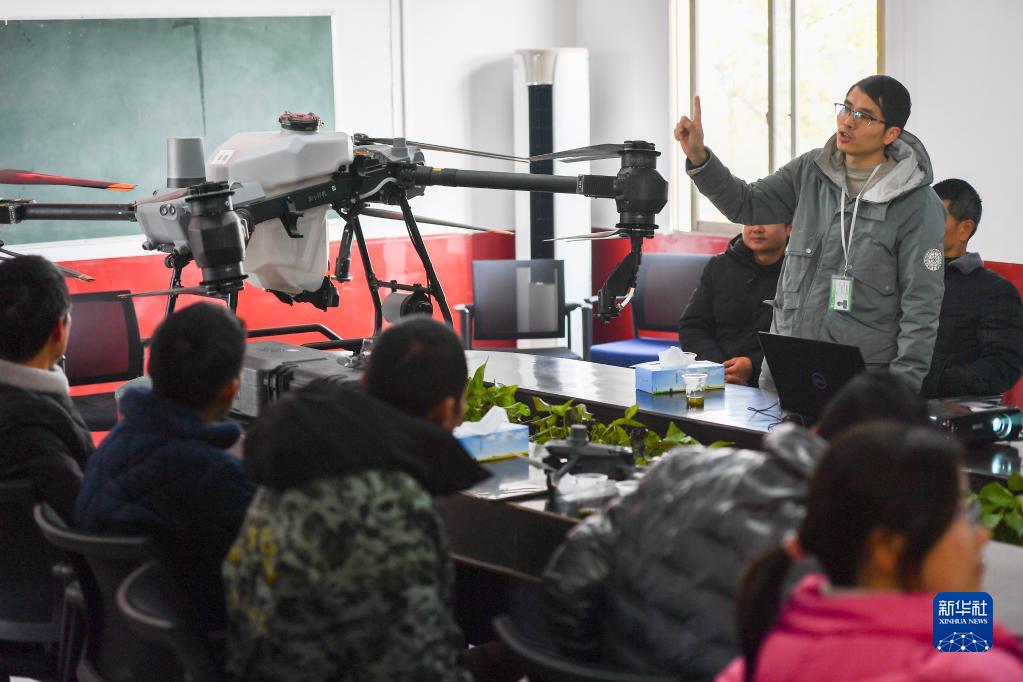 2月15日,在沅江市共华镇福安村,老师在农业植保无人机操作员培训班上讲解无人机的构造。