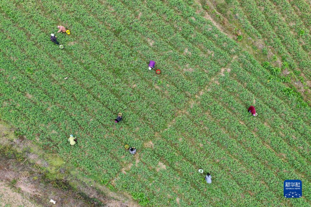 2月15日,在龙里县湾滩河镇郊外,菜农在采摘豌豆尖(无人机照片)。