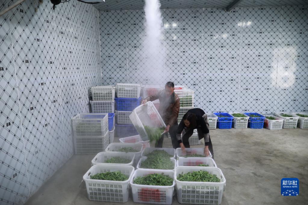 2月15日,在龙里县湾滩河镇,菜农在处理刚采摘的豌豆尖。