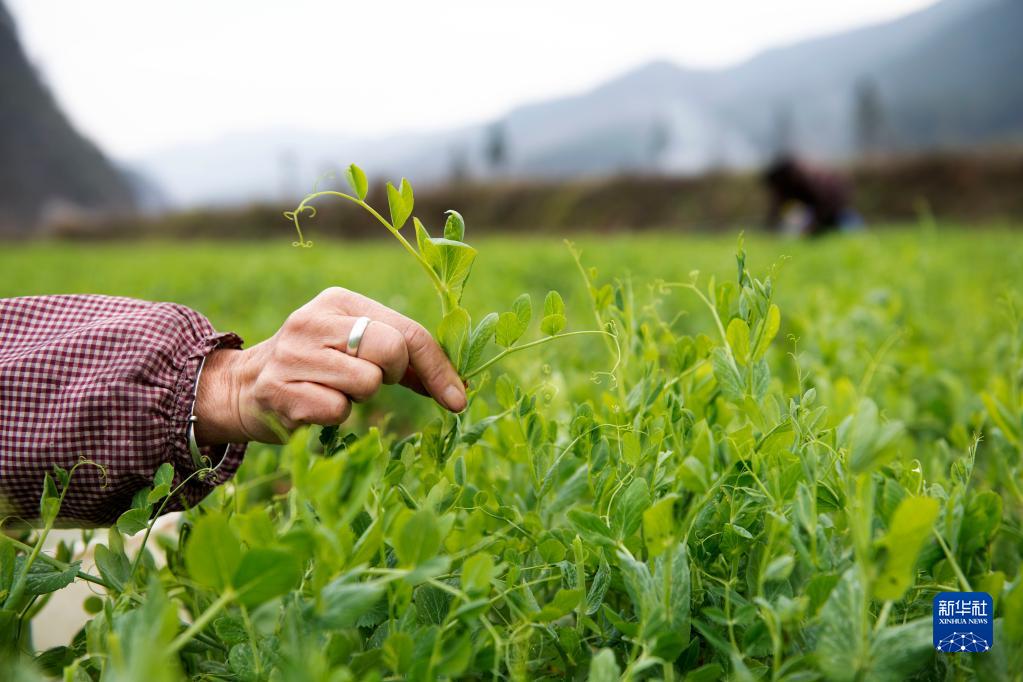 2月15日,龙里县湾滩河镇村民在地里采摘豌豆尖。