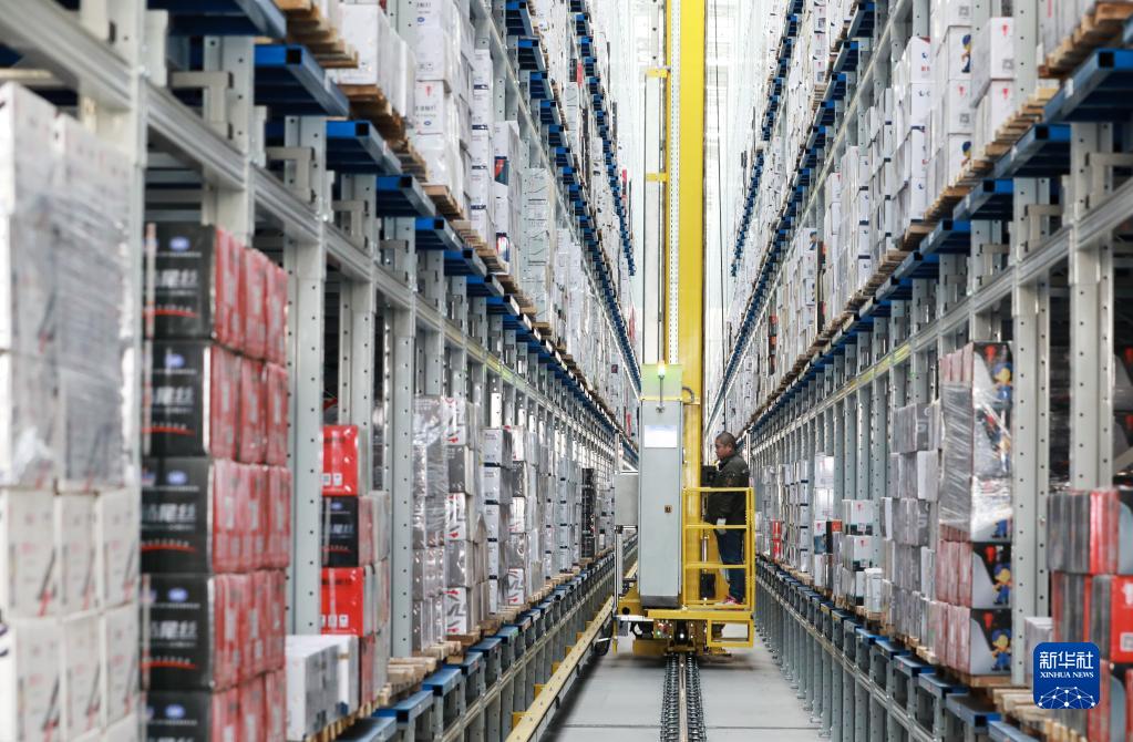2月15日,在河北省邯郸市永年区一紧固件生产企业,工人在智能仓储车间用设备装卸货物。