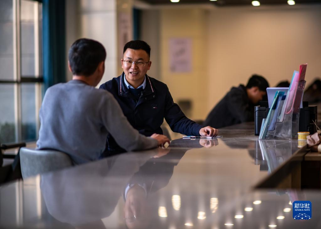 在云南省曲靖市麒麟区人力资源服务产业园内,全国人大代表袁海波(右)与准备出发的务工人员聊天(2月11日摄)。新华社记者 江文耀 摄