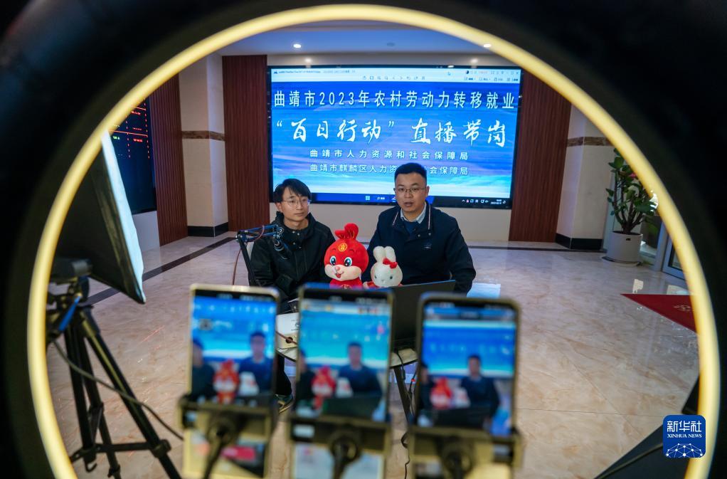 全国人大代表袁海波(右)在云南省曲靖市麒麟区人力资源服务产业园通过网络直播宣传就业服务政策(2月11日摄)。新华社记者 江文耀 摄