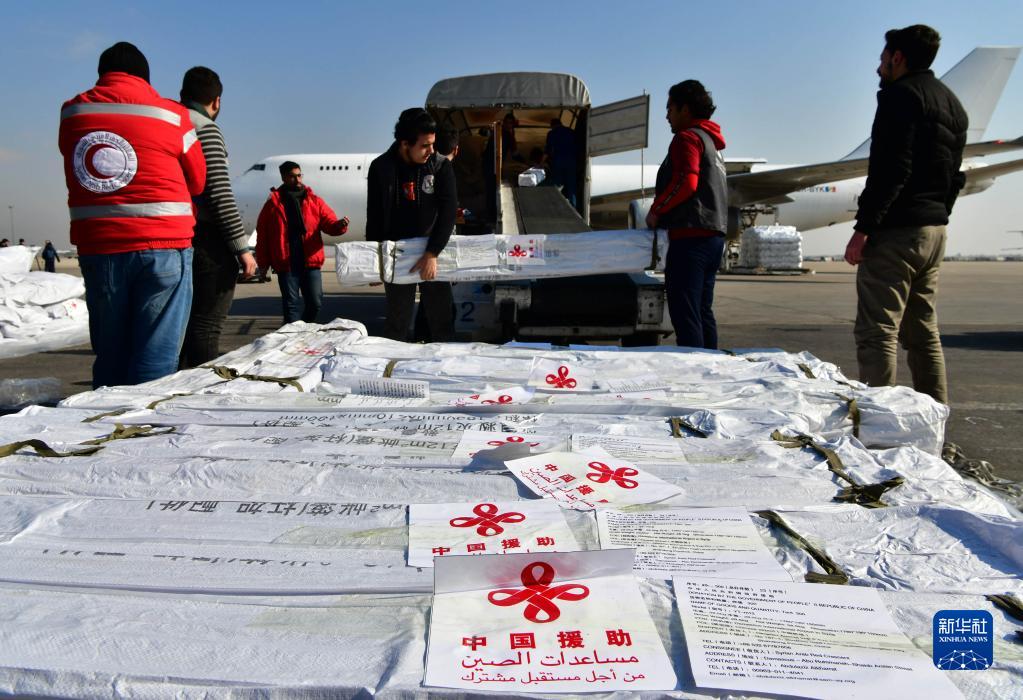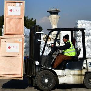 2月15日,工作人员在叙利亚大马士革国际机场卸载中国政府援助的人道主义物资。