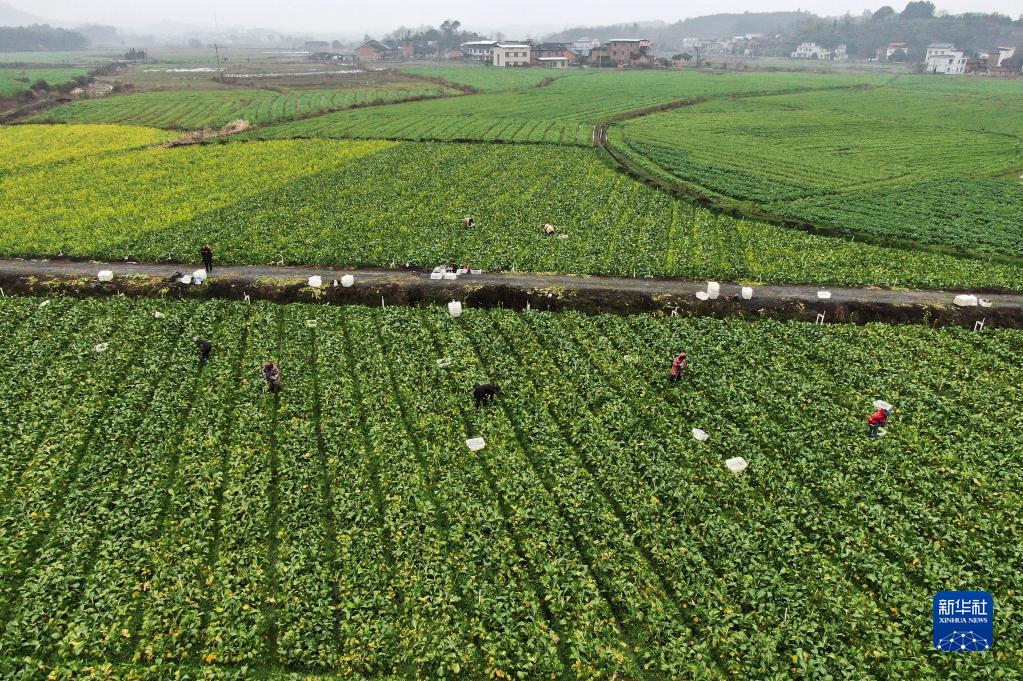 2月15日,在湖南省资兴市回龙山瑶族乡柏树村蔬菜种植基地,农民在采收菜心(无人机照片)。