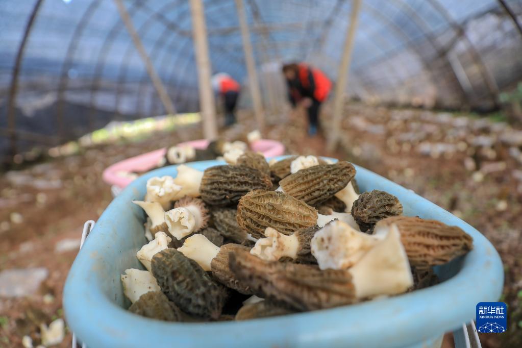 2月15日,在湖南省衡阳市衡阳县渣江镇三马新村,村民在大棚里采收羊肚菌。