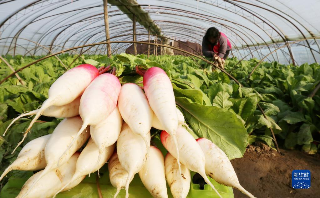 2月16日,山东省临沂市郯城县郯城街道薛城后村的村民在大棚内采收萝卜。