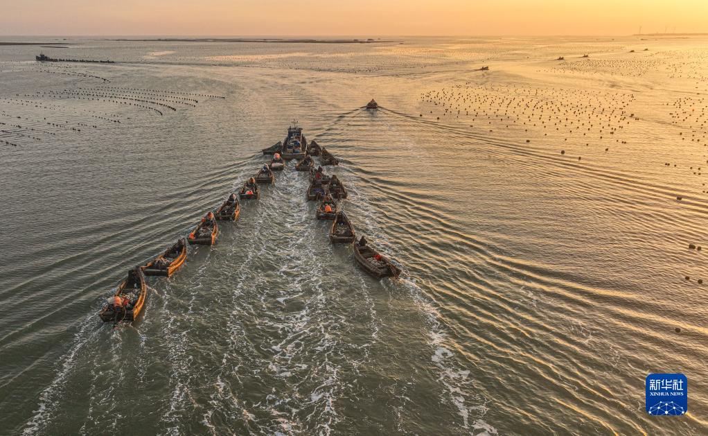 2月16日,在荣成市石岛管理区桑沟湾海洋牧场网箱养殖区,渔民驾驶渔船出海作业(无人机照片)。