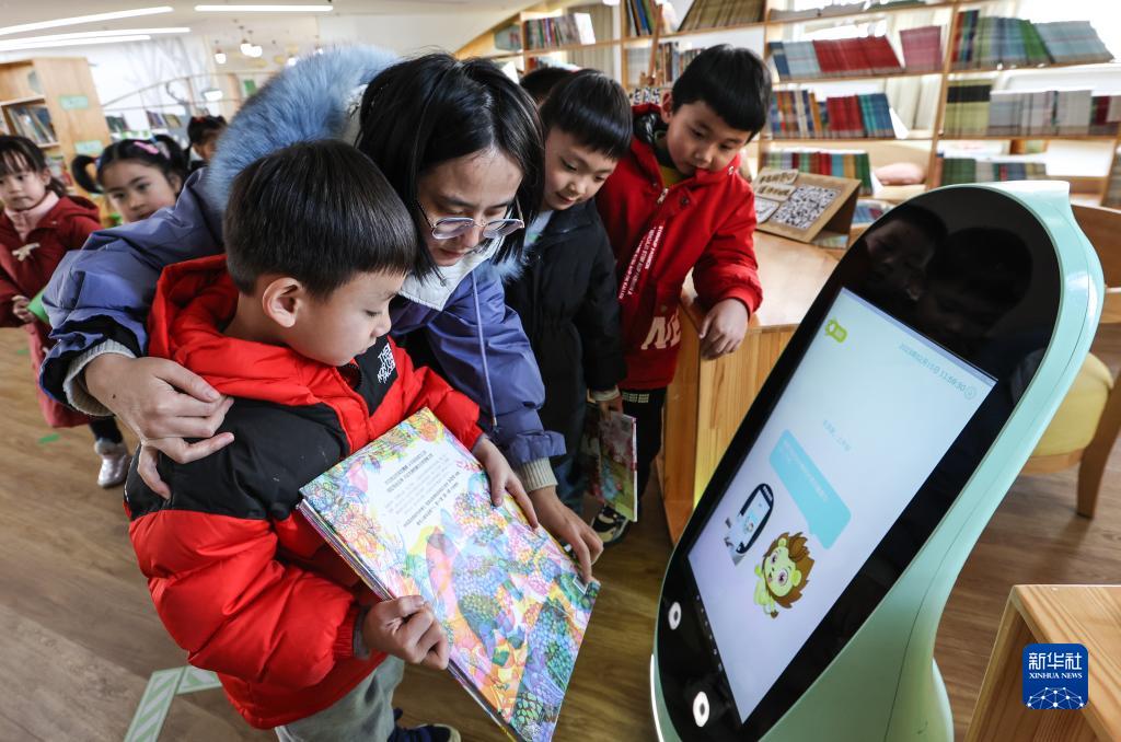2月15日,在常州市新北区龙虎塘街道中心幼儿园(盘龙新区),老师在指导小朋友通过“人脸识别+语音互动”的云上借阅系统借阅图书。