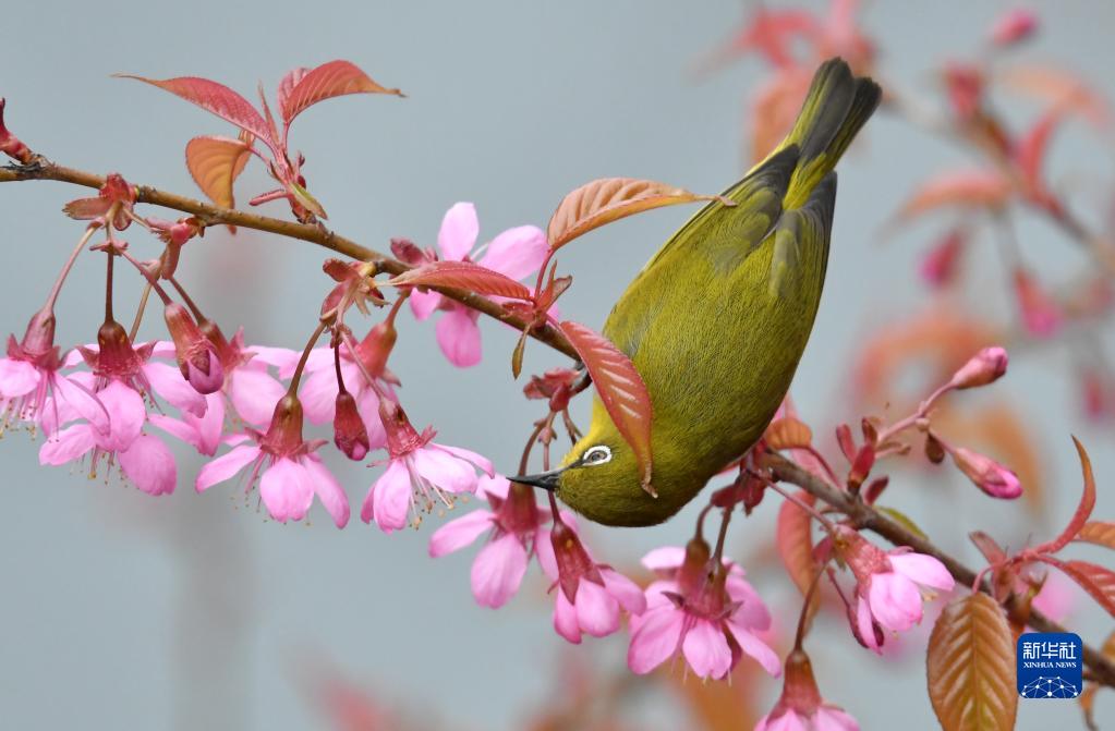 2月15日,绣眼鸟在贵州省贵阳市南明河畔水东路段的冬樱花树上穿梭于花枝间觅食啄花。