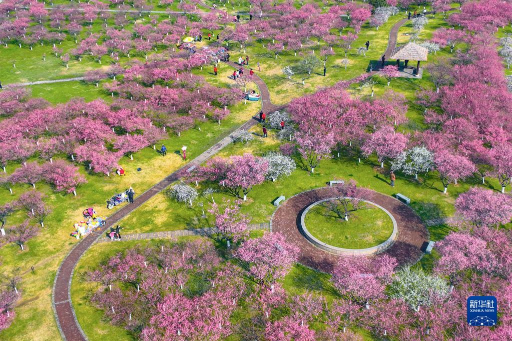 2月16日,游人在浙江省宁波市镇海区庄市街道永旺村梅花园游玩(无人机照片)。