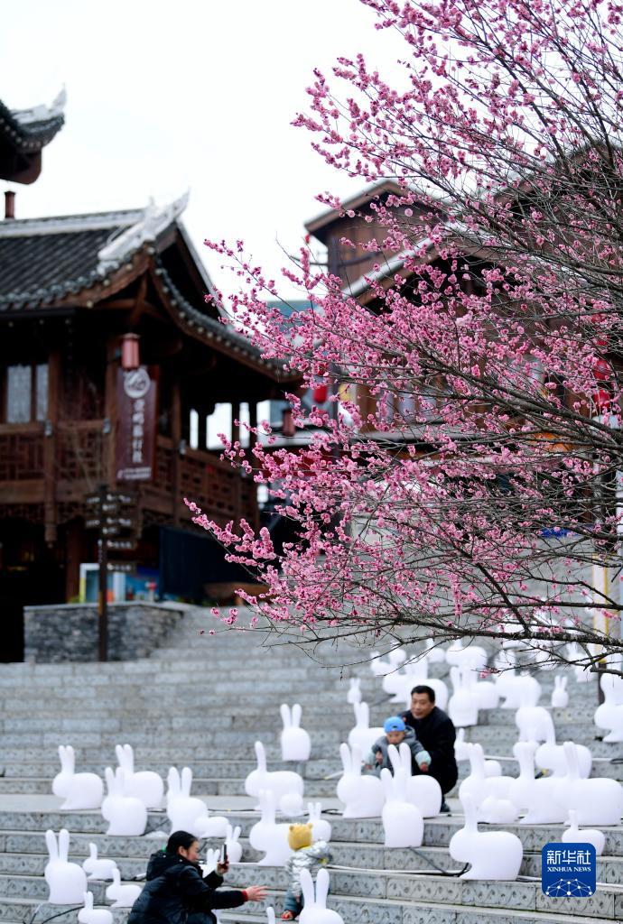 2月15日,在湖北省宣恩县城兴隆老街,人们在梅花掩映下的吊脚楼前游玩。