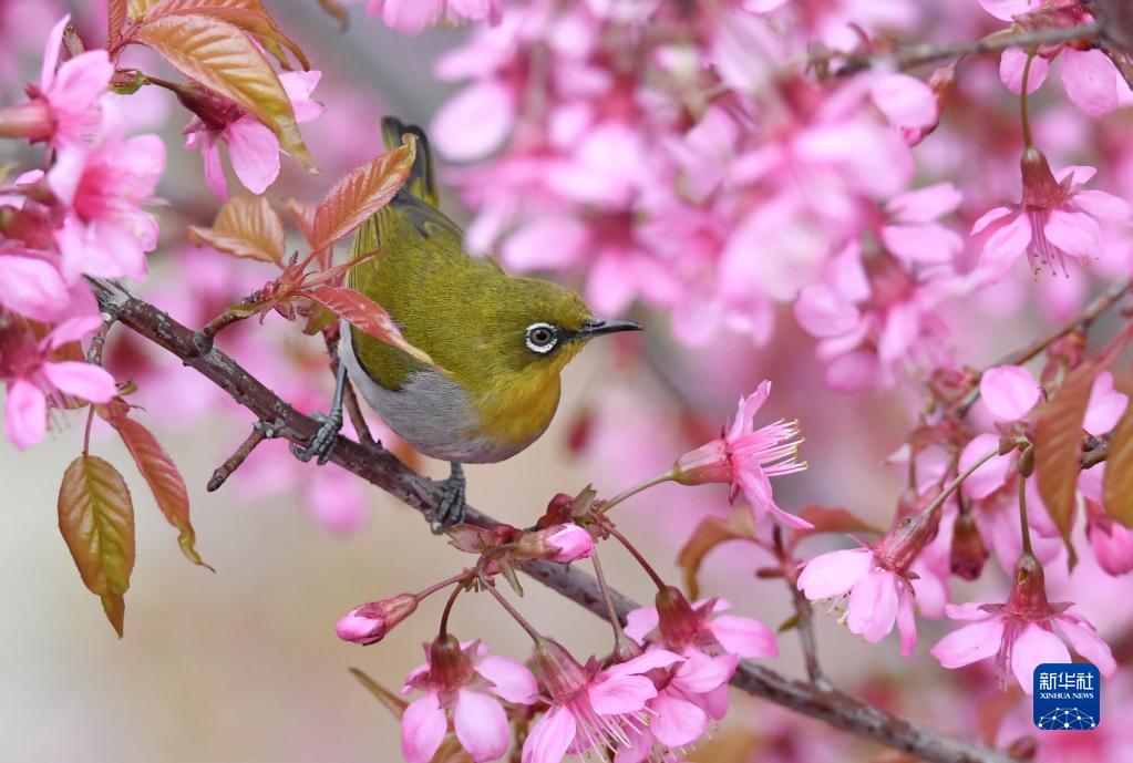 2月15日,绣眼鸟在贵阳市南明河畔水东路段的冬樱花树花枝间觅食啄花。