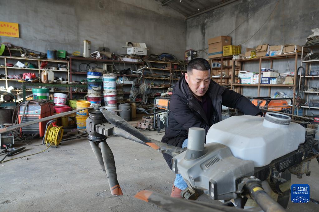2月15日,山东省威海市文登区金农会农业专业合作社负责人于进海在检修农业无人机。