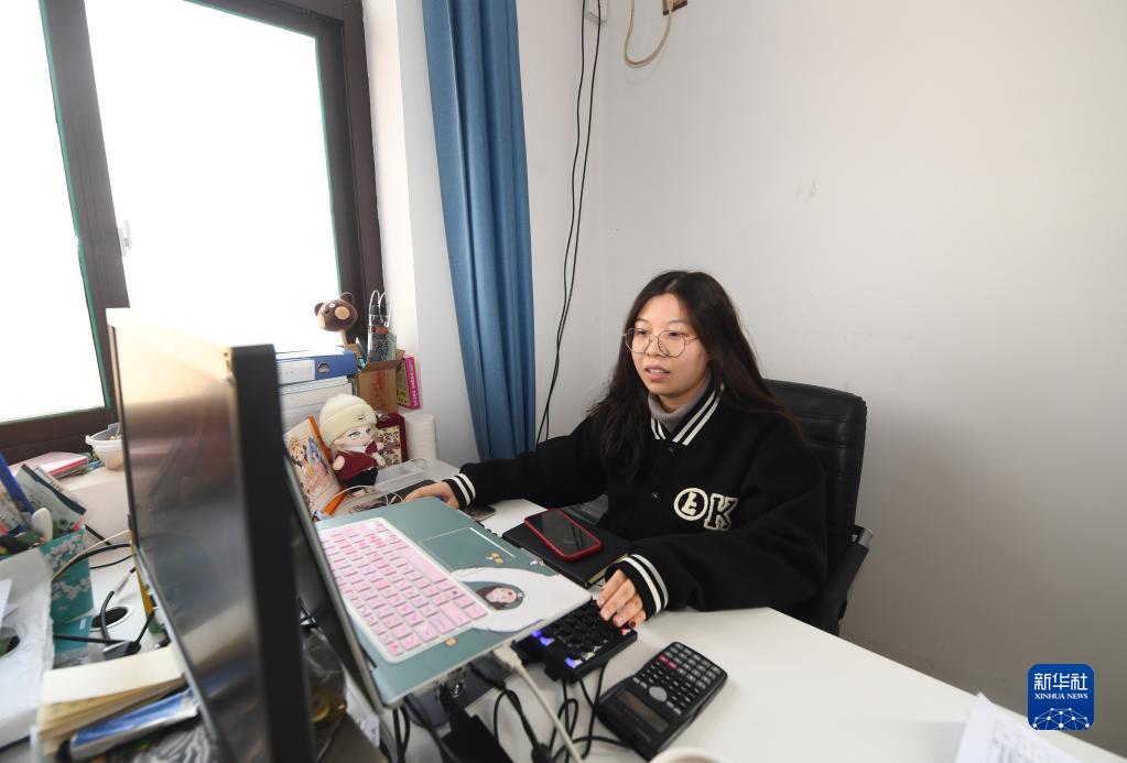 杨鑫博在项目部办公室工作(2月15日摄)。