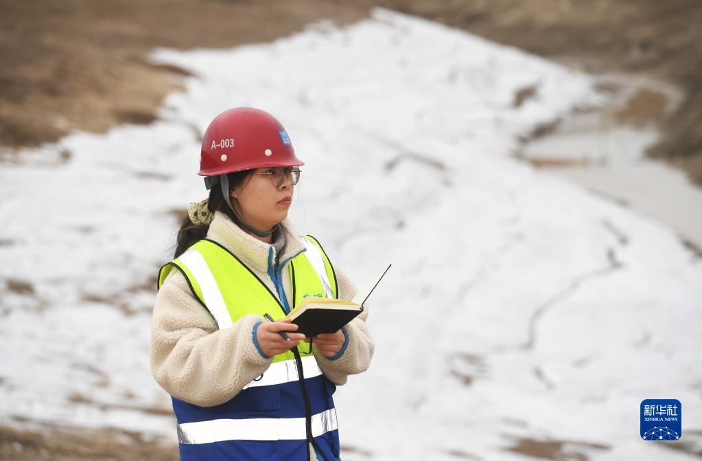 杨鑫博在雄安唐河河谷郊野公园项目现场工作(2月15日摄)。