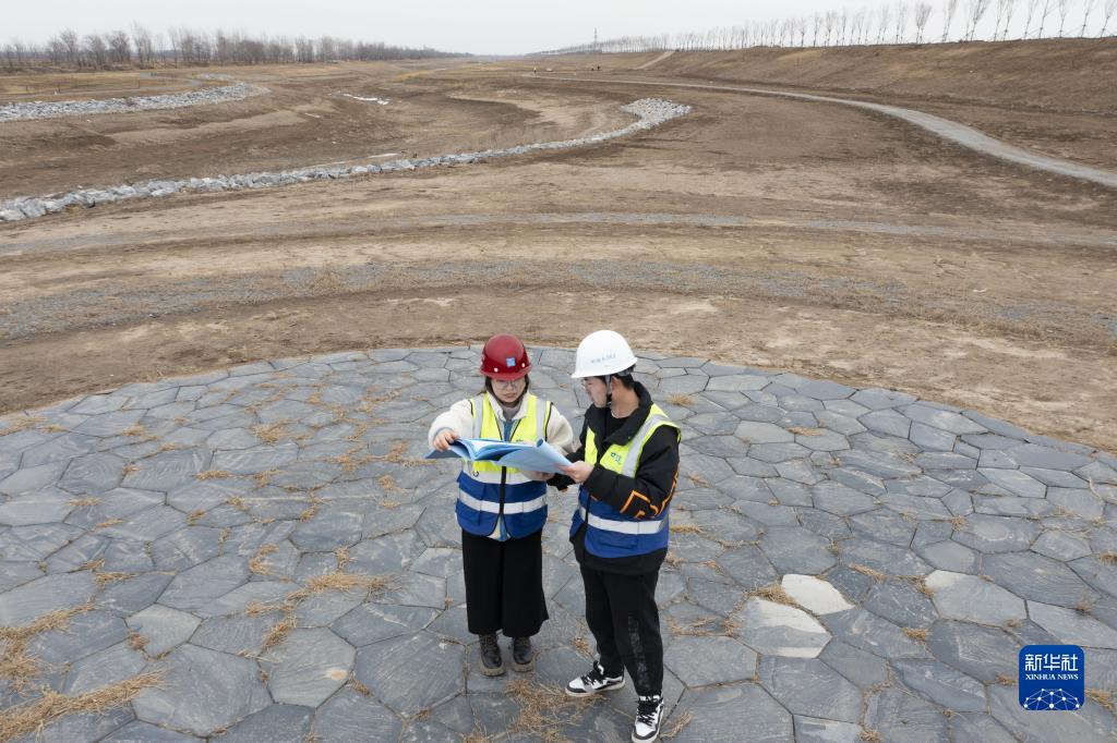 杨鑫博(左)和同事在雄安唐河河谷郊野公园项目现场工作(2月15日摄,无人机照片)。