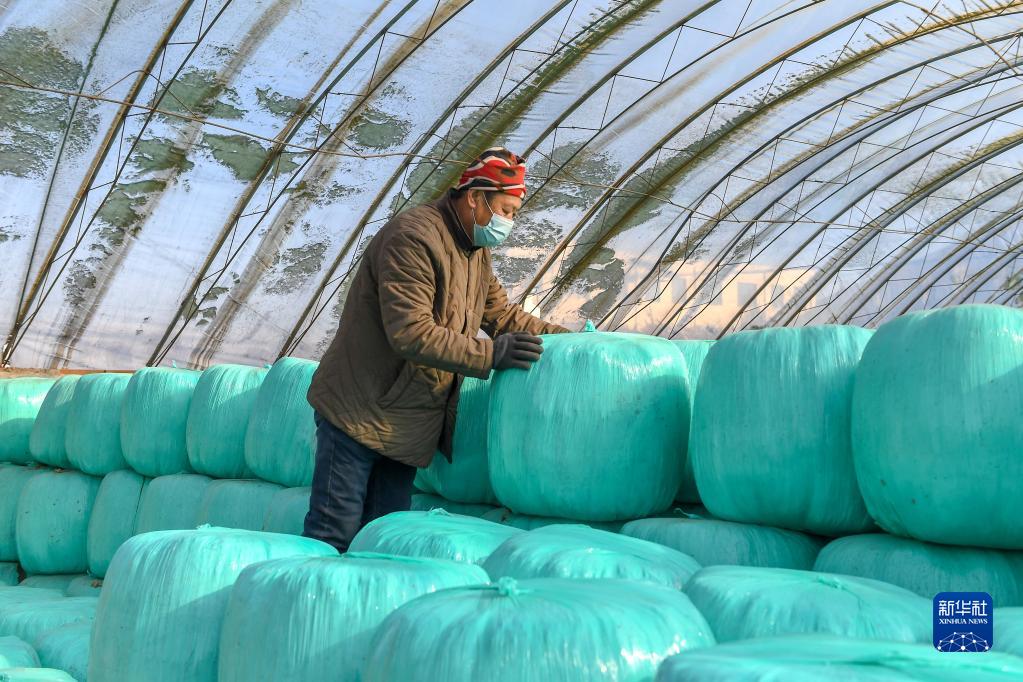 2月16日,在吉林省长春市九台区东湖街道腰站村,隆达兴养殖农民专业合作社农民整理玉米秸秆压缩包。