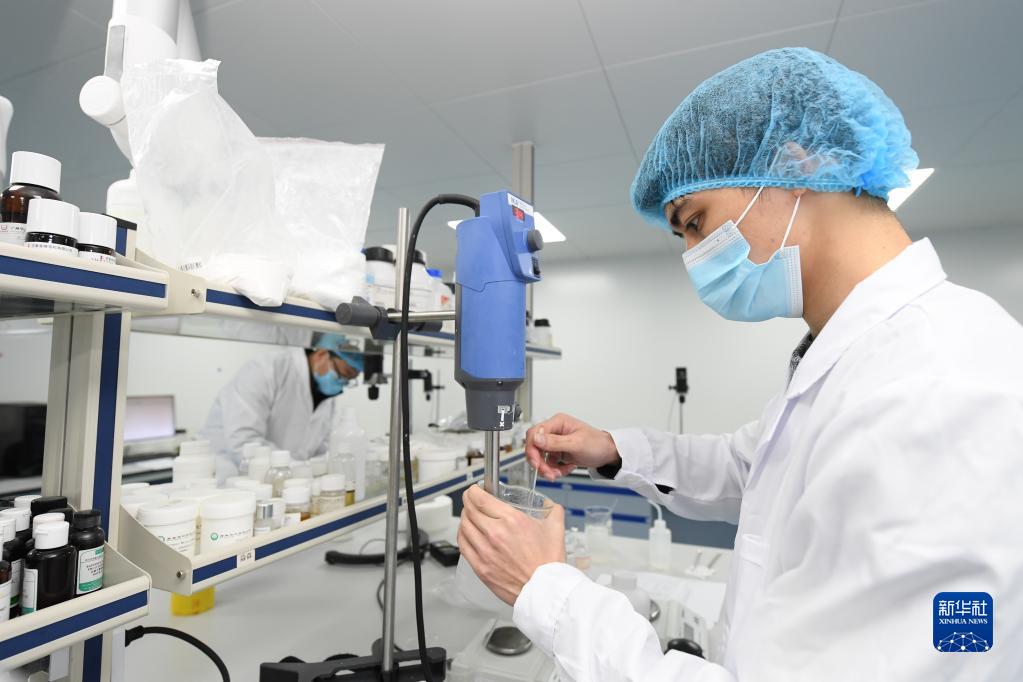 2月16日,在美妆小镇一家小微化妆品企业,工作人员在实验室进行新产品的检测研发。