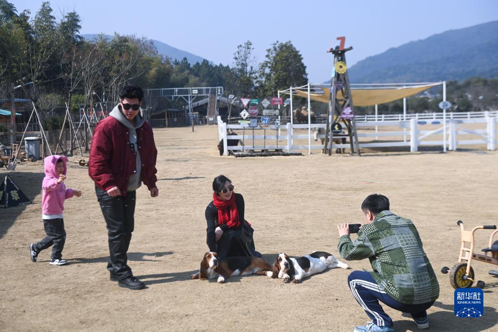 2月16日,游客在道场乡菰城村的GoFarm趣农场内与小动物互动玩耍。