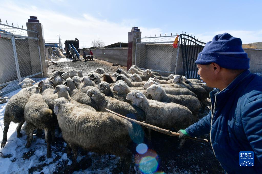 在古浪县黄花滩镇黄花滩村,村民将出售的肉羊赶出养殖圈舍(2月15日摄)。
