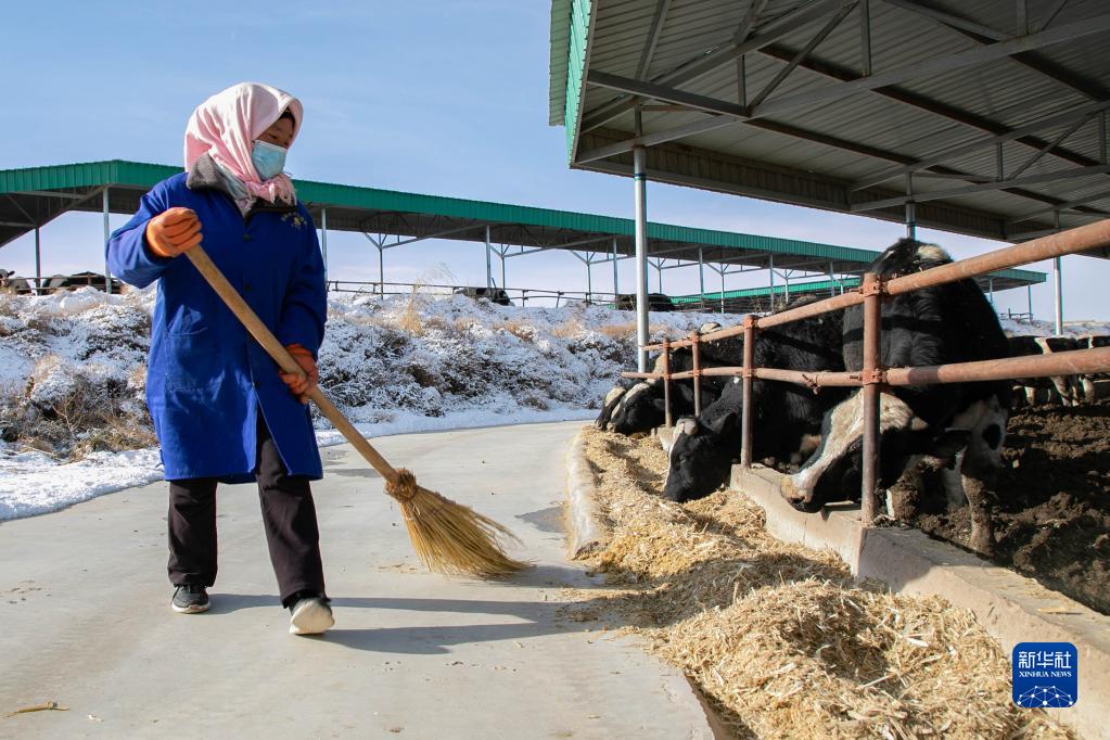 在古浪县西靖镇肉牛养殖基地,工作人员打扫牛棚卫生(2月15日摄)。