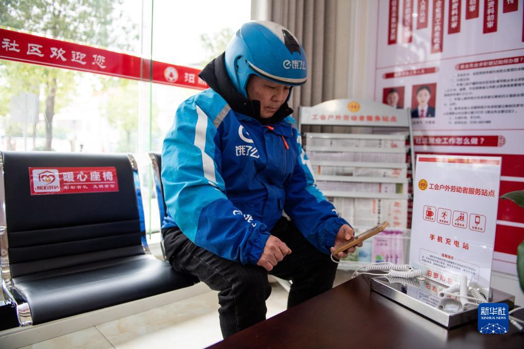 2月16日,在汨罗市归义镇汨新社区“暖心驿站”,一名外卖配送员在给手机充电。