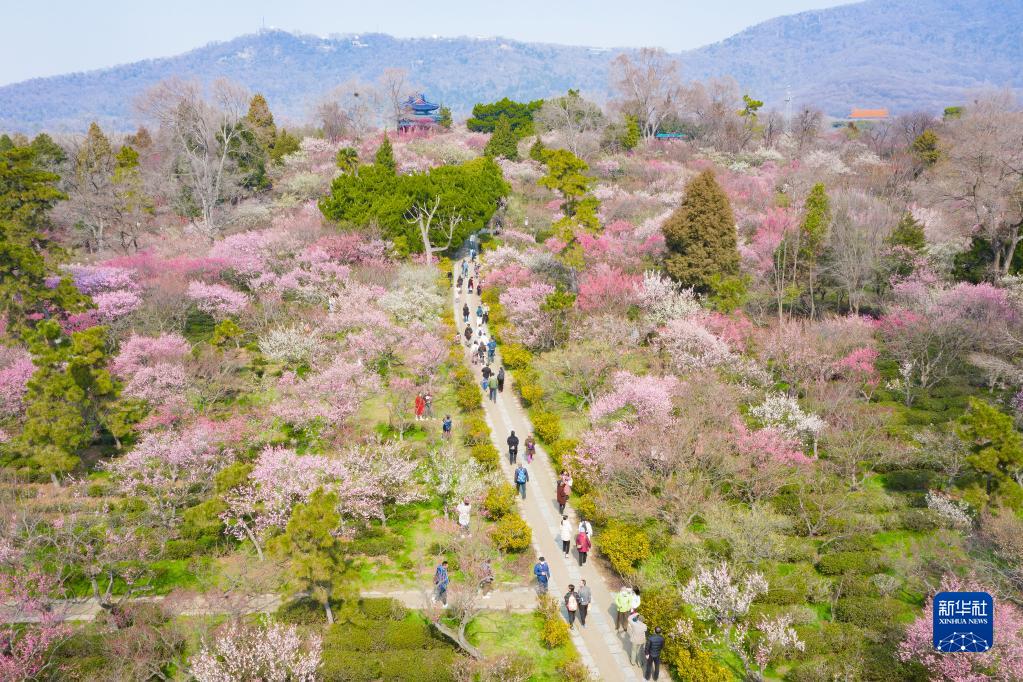 2月16日,游人在南京梅花山赏花(无人机照片)。