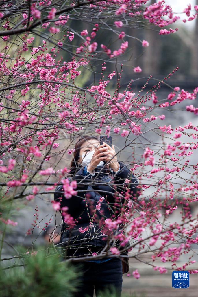 2月16日,游人在南京莫愁湖公园里拍摄梅花。