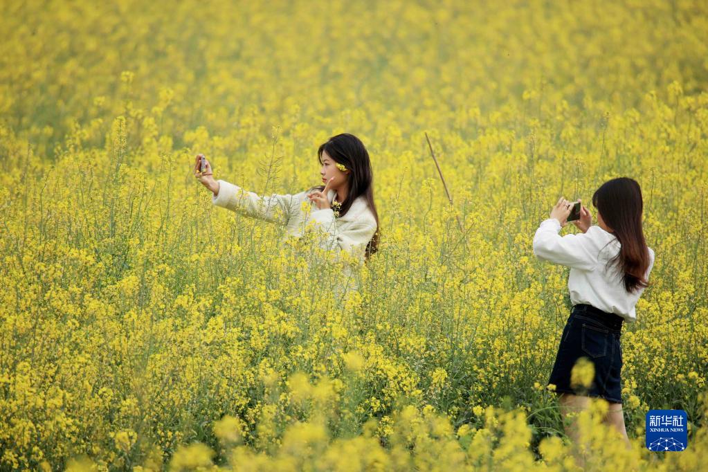 2月16日,游客在广西柳州市融安县浮石镇桥头村油菜花海中游玩。