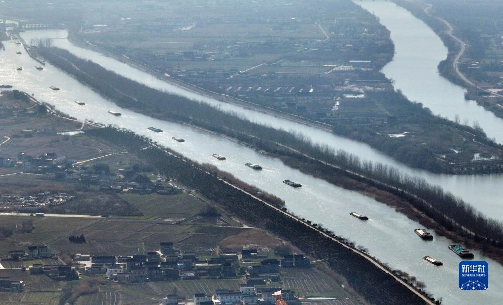 2月15日,货船行驶在京杭大运河江苏扬州段(无人机照片)。