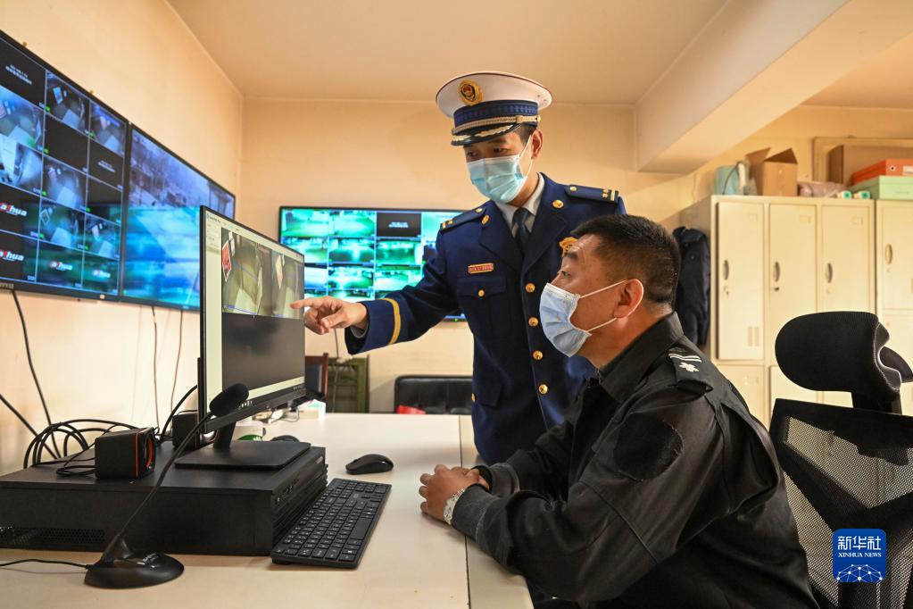 2月16日,天津市东丽区消防救援支队工作人员在张贵庄街道华亭里社区跃丽家园小区消防安全控制室与工作人员核查智能梯控系统运行情况。