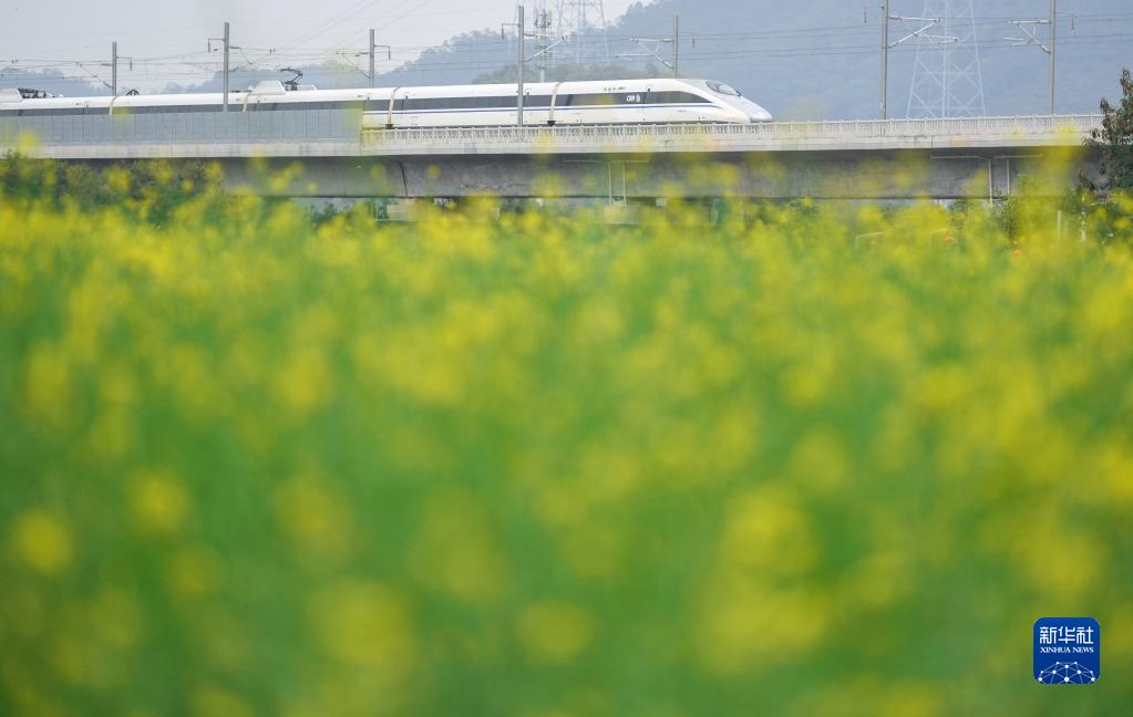 2月16日,和谐号列车驶过深圳光明区的油菜花田。