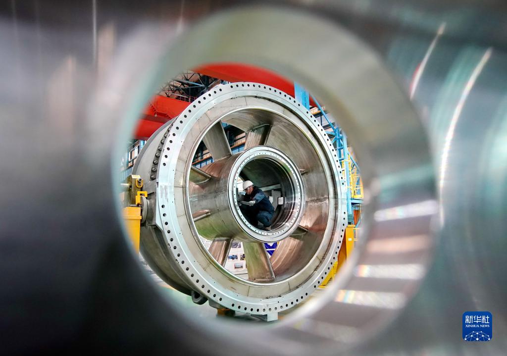 2月16日,哈电集团(秦皇岛)重型装备有限公司的工人在生产车间工作。