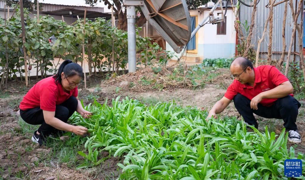 2月14日,在中非共和国首都班吉,第19批援中非中国医疗队妇科医生张丽霞(左)和麻醉医生张才军在驻地菜地里拔草。