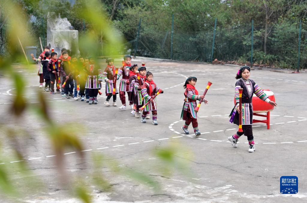 2月16日,贵州省从江县西山镇中寨教学点学生练习瑶族长鼓舞。
