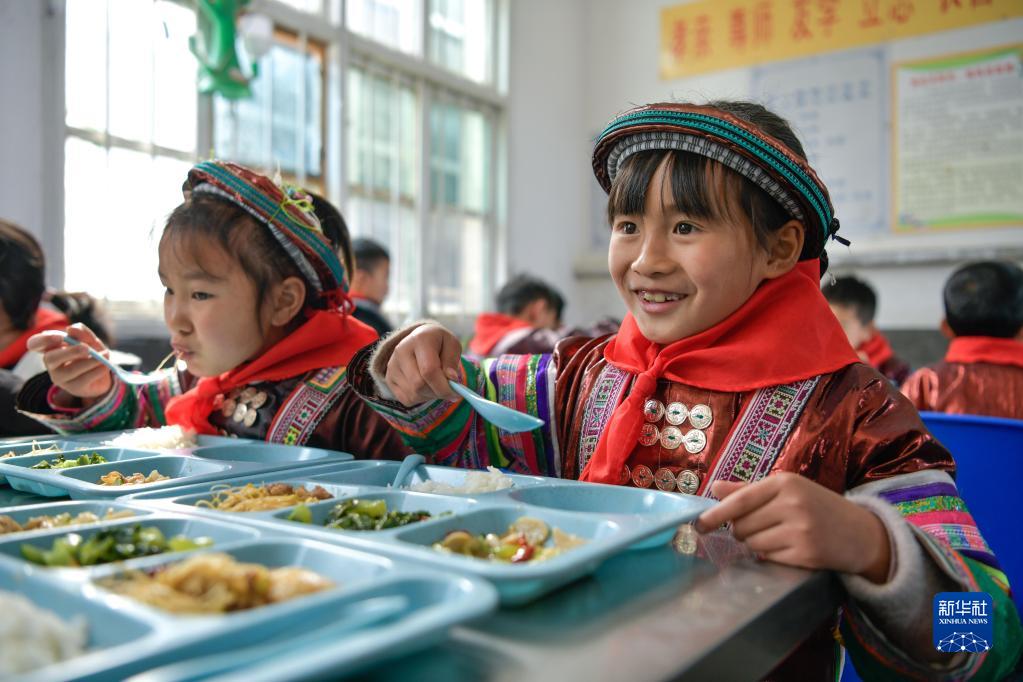 2月16日,贵州省从江县西山镇中寨教学点学生在享用免费营养午餐。