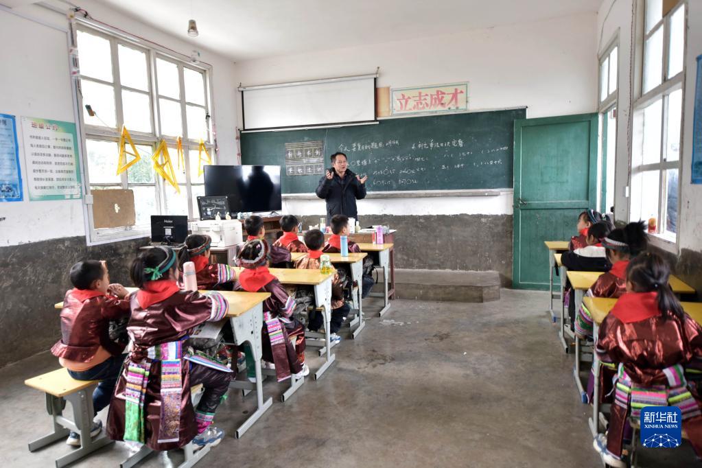 2月16日,贵州省从江县西山镇中寨教学点教师孟荣达给学生上课。