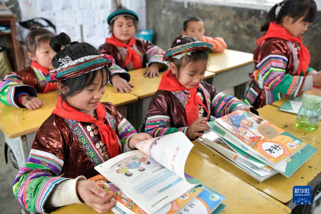2月16日,贵州省从江县西山镇中寨教学点学生领到新书。