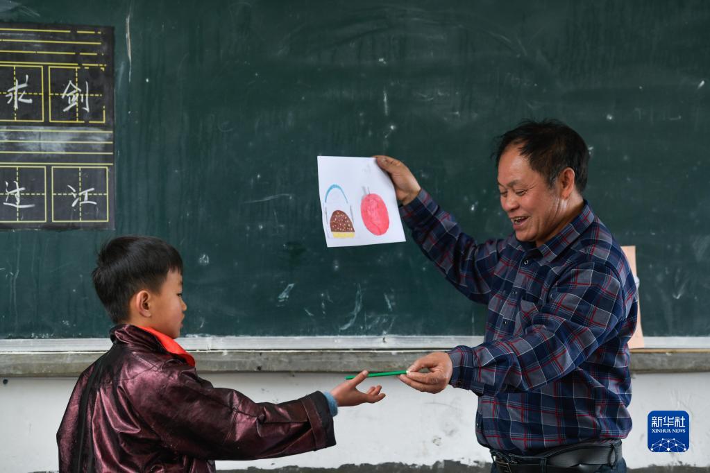 2月16日,贵州省从江县西山镇中寨教学点教师孟荣达(右)给美术手工课上表现好的学生发放画笔奖品。