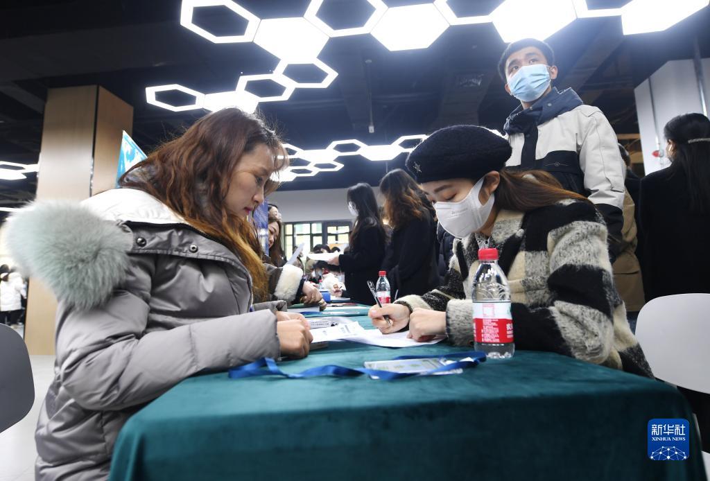2月17日,求职者在人才集市上填写求职意向表。