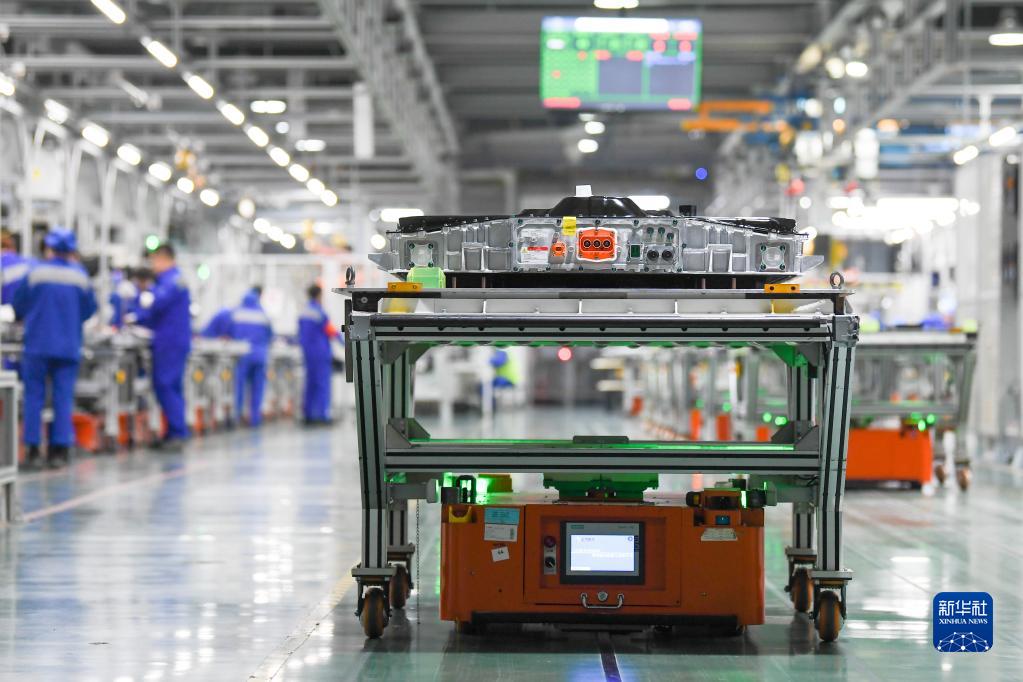 2月16日,在上汽时代动力电池系统有限公司车间,一辆运输车在运送安装完成的动力电池系统件。常州市拥有锂电池电芯及配套生产企业120余家,动力电池产业2022年实现产值超1700亿元。