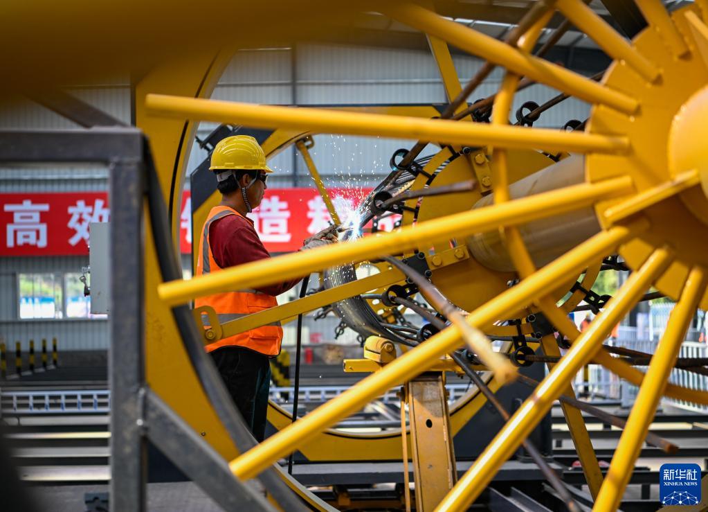 2月17日,在位于达州市境内的中铁四局西渝高铁钢筋加工厂,工人在焊接钢筋笼。