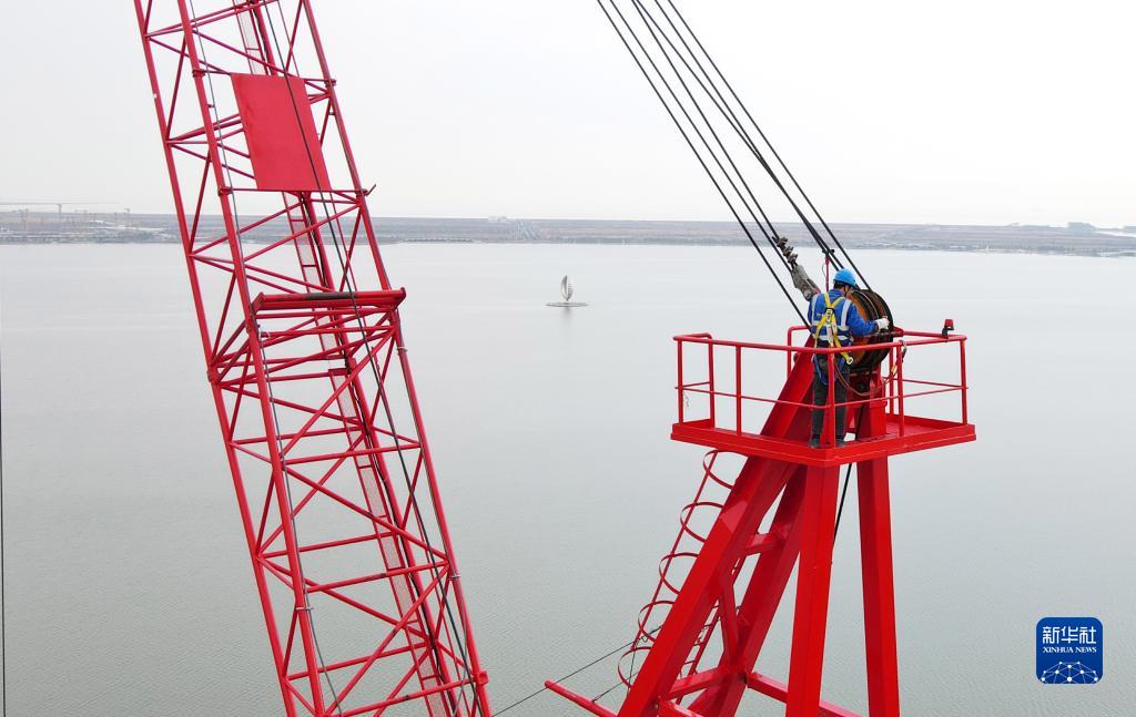 2月17日,在位于中国(上海)自由贸易试验区临港新片区的中建二局临港西岛中银金融中心项目工地,一名智能造楼机动力臂驾驶员在进行钢缆安全例行检查(无人机照片)。