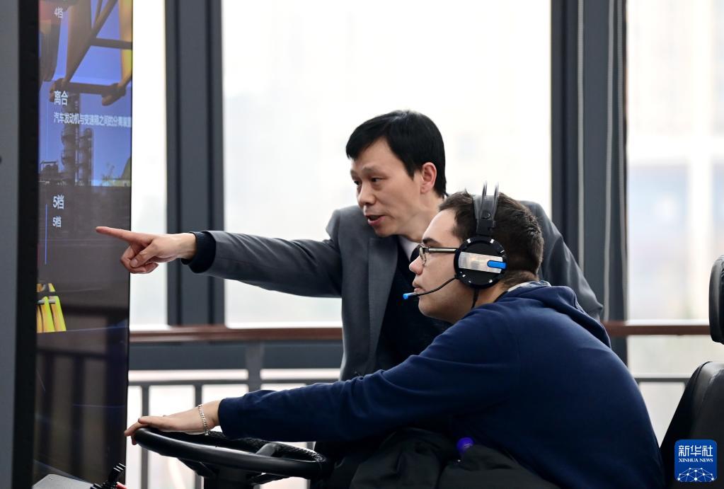 2月17日,在西铁教育培训基地,西安交通大学的罗马尼亚留学生(前)在货装实训室体验模拟驾驶。