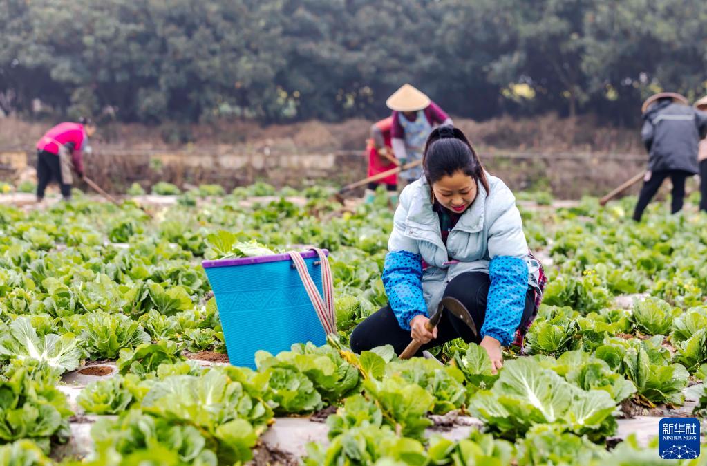 2月17日,农户在贵州省六盘水市六枝特区木岗镇木岗冲村采收白菜。