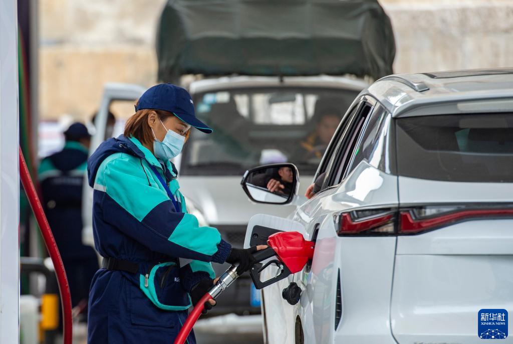 2月17日,贵州省从江县一加油站工作人员给汽车加油。
