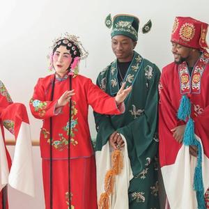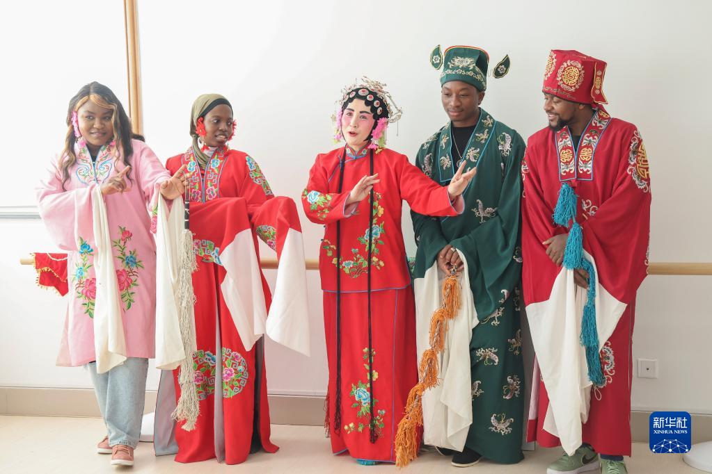 2月17日,在山东省临沂市兰山区枣园镇弦子戏非遗展厅,当地非遗传承人刘妮(左三)指导留学生体验唱弦子戏。