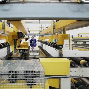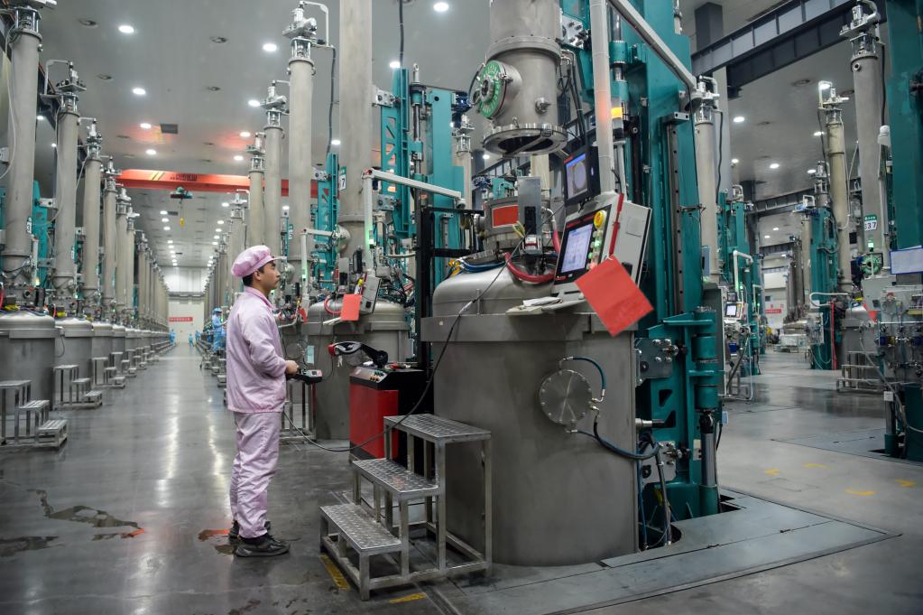 2月17日,在中建材佳星玻璃(黑龙江)有限公司车间内,工作人员在智能生产线旁巡检。